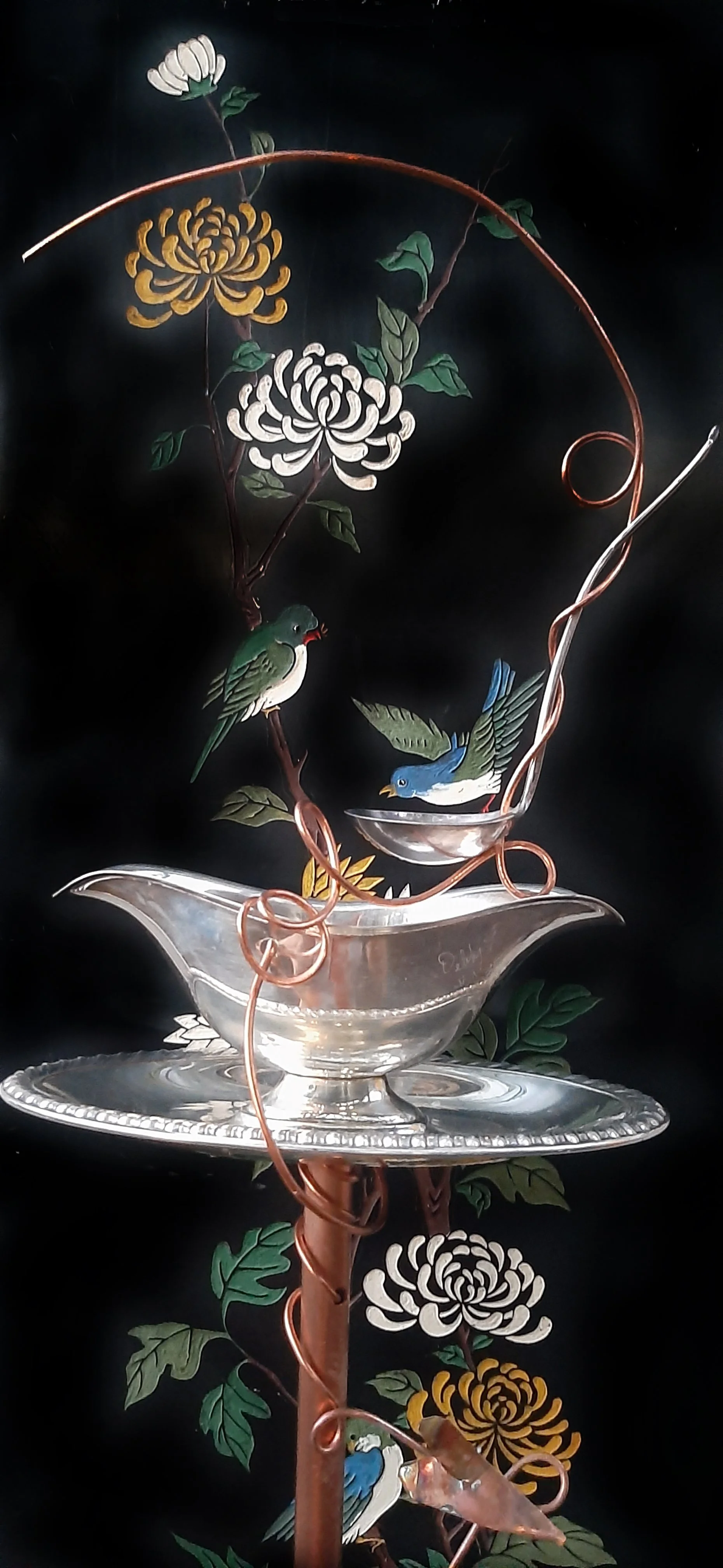 Debby Loflin has offered her quality handbags and accessories utilizing the finest quality new and upcycled fabrics, leathers, furs, and hardware at the Lakeside Artists Studio Tour for many years, but we are very excited that she now brings another beautiful art form as well. Debby transforms vintage silver plated pieces into enchanting birdfeeders. Each unique find is mounted on a copper pole and adorned with sculpted copper vines and hand-cut leaves to be used as a birdfeeder, planter, or simply as joyful garden art. Want a piece of functional art designed just for you? See Debby to place your custom order! HandBagzandGladRagz.com and HandbagzandGladRagz